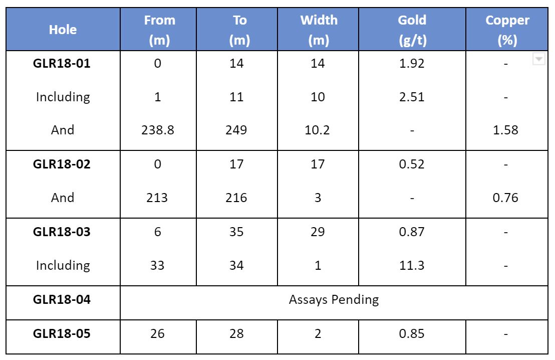 The drill holes completed to date have intersected volcanic fragmental rocks, all of which have been variably altered and represents part of a significant hydrothermal system. Drill holes GLR18-01, GLR18-02 and GLR18-03 were designed to form a section beneath Trench 4 and intersected a 28 metre to 32 metre true thickness of quartzhematite breccia from surface. The breccia is predominantly clast supported with 1.0 millimetre to 20 centimetre sub-rounded clasts of quartz with interpreted pyrophyllite/dickite and specular hematite in an earthy hematite matrix. This unit hosts the gold mineralization observed in trenching and drilling. Gold correlates with elevated silver, bismuth, molybdenum, lead and antimony. Beneath this unit is a 3.0 metre band of massive quartz and interpreted pyrophyllite/dickite alteration that has pervasively replaced an earlier tuff unit.