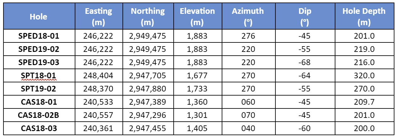 In drill hole SPED18-01 located 72 metres to the north, the zone consists of a zone of minor calcite and quartz veinlets with strong pathfinder element geochemistry but only anomalous gold values.