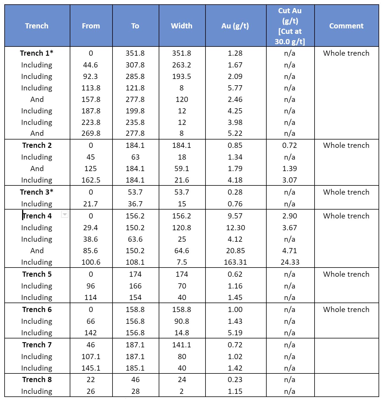 Table 1 – Significant trench intersections. (*Trenches 1 and 3 have been previously reported on April 9, 2018 and Trenches 2, 4 and 5 where reported on September 12, 2018).
