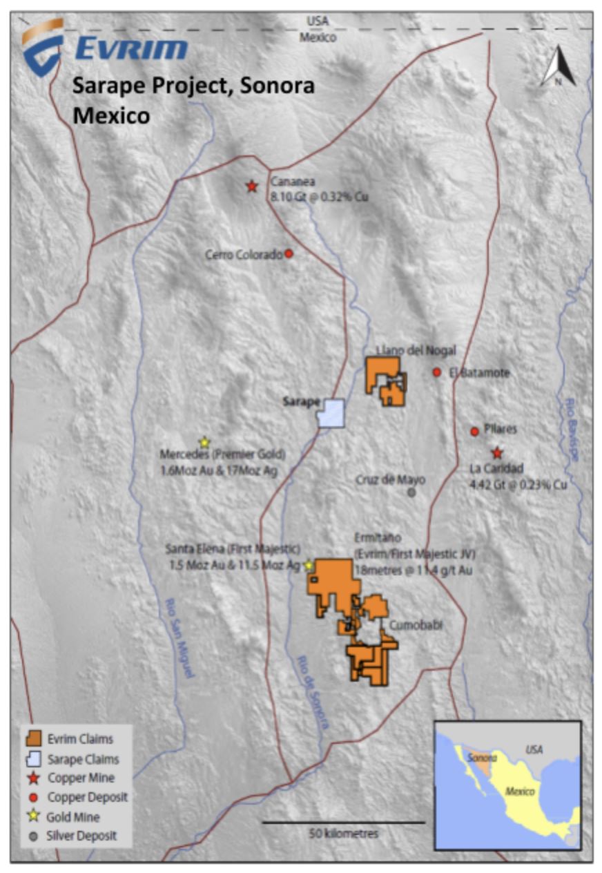 Vancouver B.C. – February 20, 2018: Evrim Resources Corp. (TSX.V:EVM) (“Evrim” or the “Company”) is pleased to announce that it has signed a Letter of Intent (the “LOI”) with a subsidiary of Coeur Mining, Inc. (“Coeur”) on the Company’s Sarape epithermal gold-silver project in Sonora, Mexico. Coeur may acquire up to an 80% interest in Sarape by spending US$16.5 million on exploration, making staged cash payments of US$2.4 million, and completing a National Instrument (“NI”) 43-101 compliant Feasibility Study on a minimum measured and indicated resource estimate of 1,000,000 ounces gold equivalent, within a ten-year period. Sarape is located in an emerging epithermal gold belt that hosts Premier Gold’s Mercedes Mine, First Majestic Silver’s Santa Elena Mine, and the Ermitaño gold discovery, a project under option to First Majestic Silver.