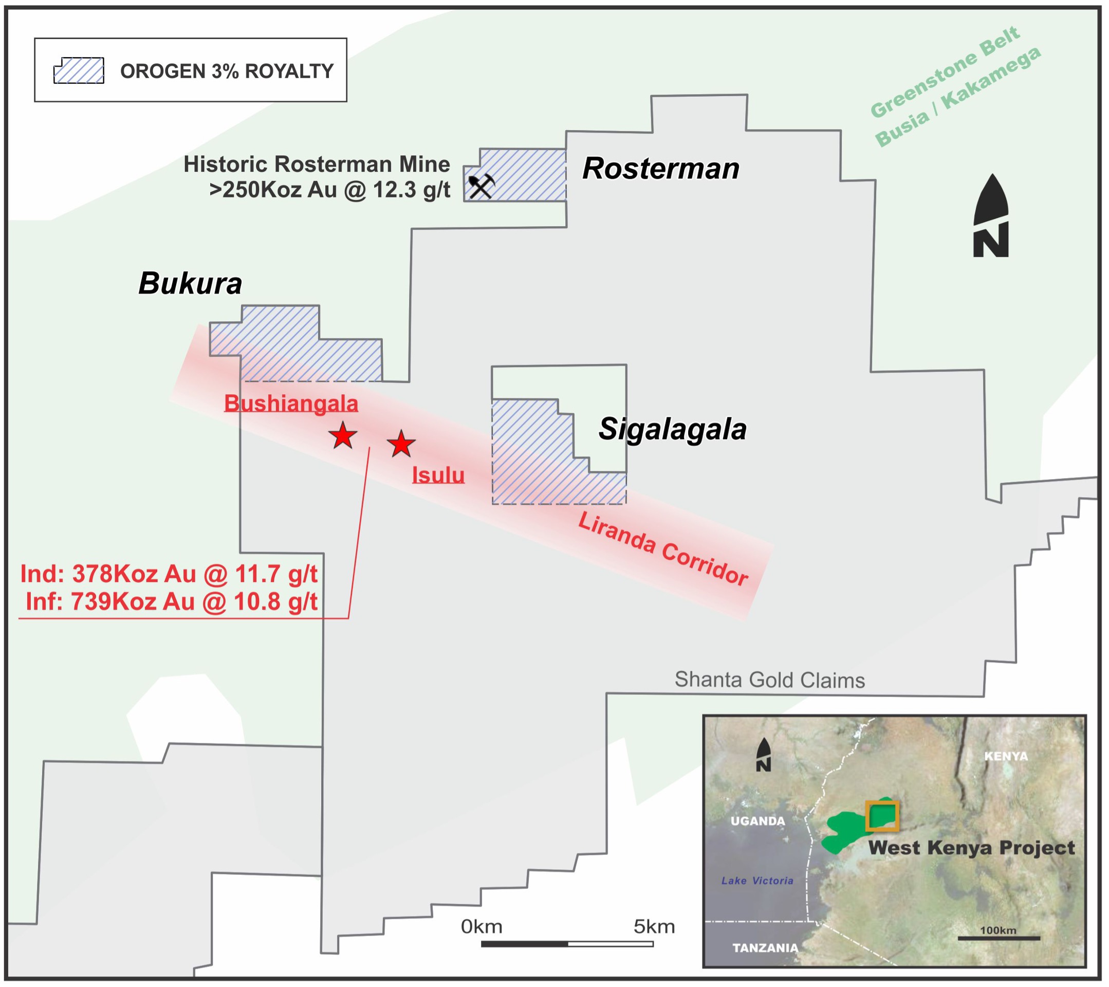 The Rosterman, Sigalagala, and Bukura royalties cover 19.75 square kilometres of prospective ground held by Shanta Gold Limited (“Shanta Gold”) (AIM:SHG.L) in the Liranda Corridor, a structural zone within the northern-most greenstone belt in the LVG.