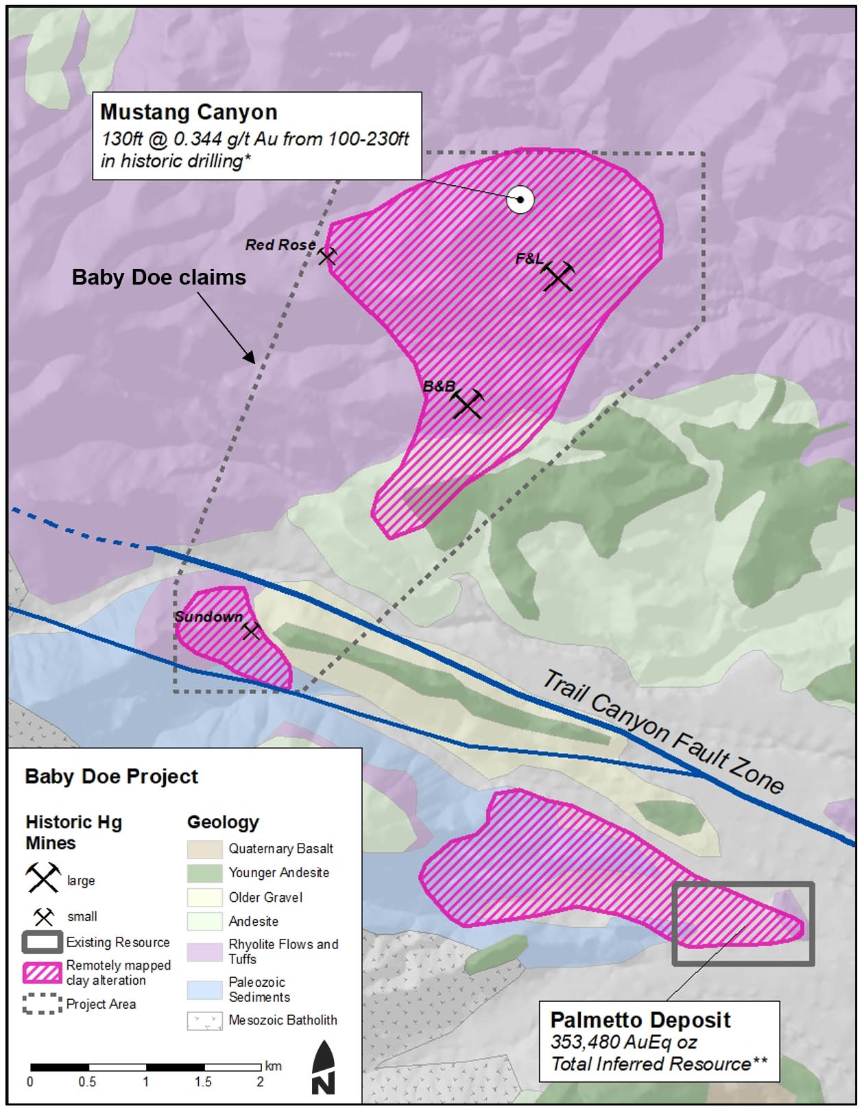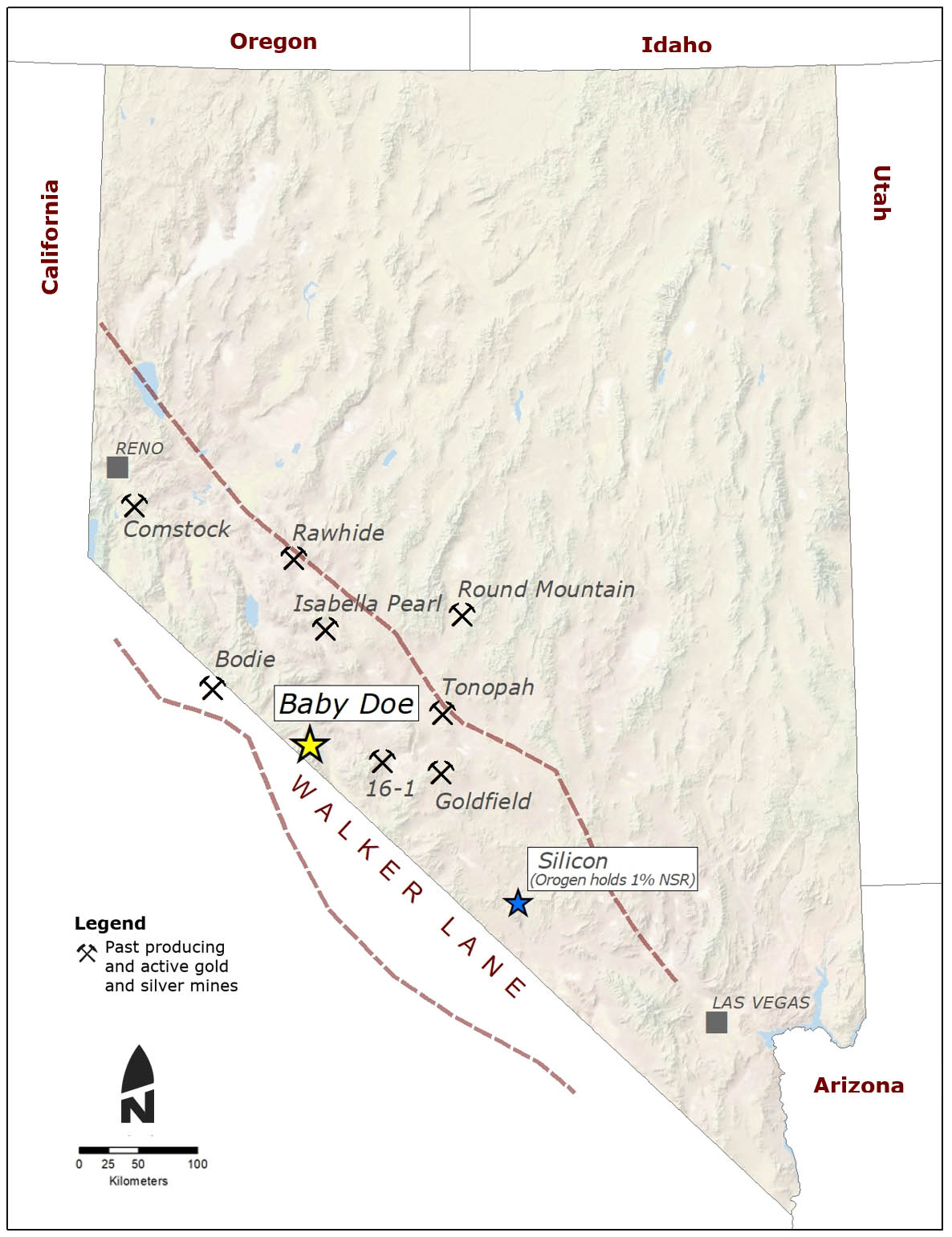 The Baby Doe project is a gold-silver epithermal vein prospect located in the White Mountains, Esmeralda county, Nevada (Figure 1). The project lies within a large, shallow level, steam heated alteration zone containing historic mercury mines. Outcropping drilled gold systems occur to the north and south of the project area, and the most intensely altered portion of the system on the Baby Doe property has seen only limited historic drilling and no known deeper tests of the system (Figure 2). This project was generated as part of a regional generative program focusing on steam-heated alteration zones interpreted to occur above epithermal gold deposits, similar to the Silicon project that is being advanced by AngloGold Ashanti NA, where Orogen holds a 1% NSR.
