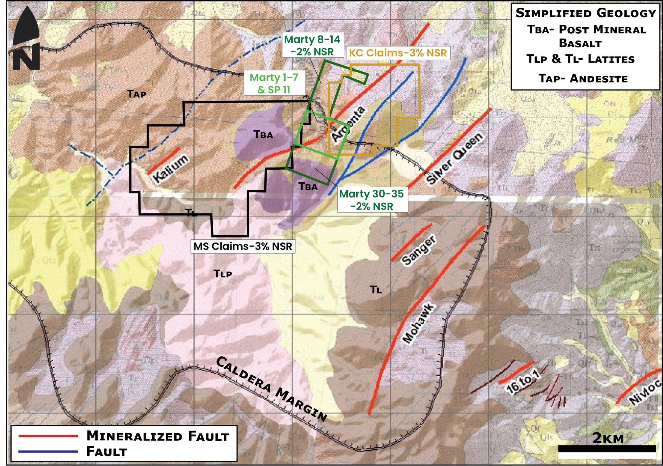 The Project contains the Kalium and Argenta zones, northeast trending mineralized structures that run parallel to the historic 16-1, Nivloc, and Mohawk mines where