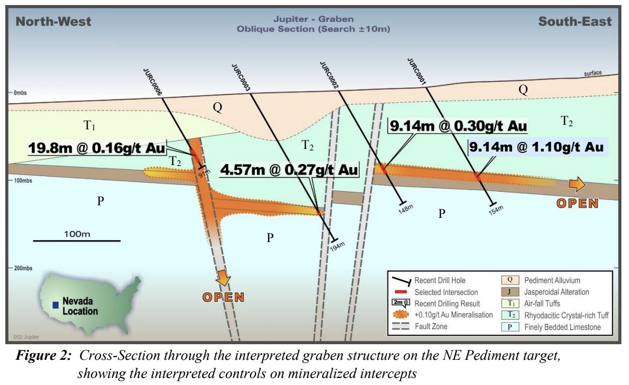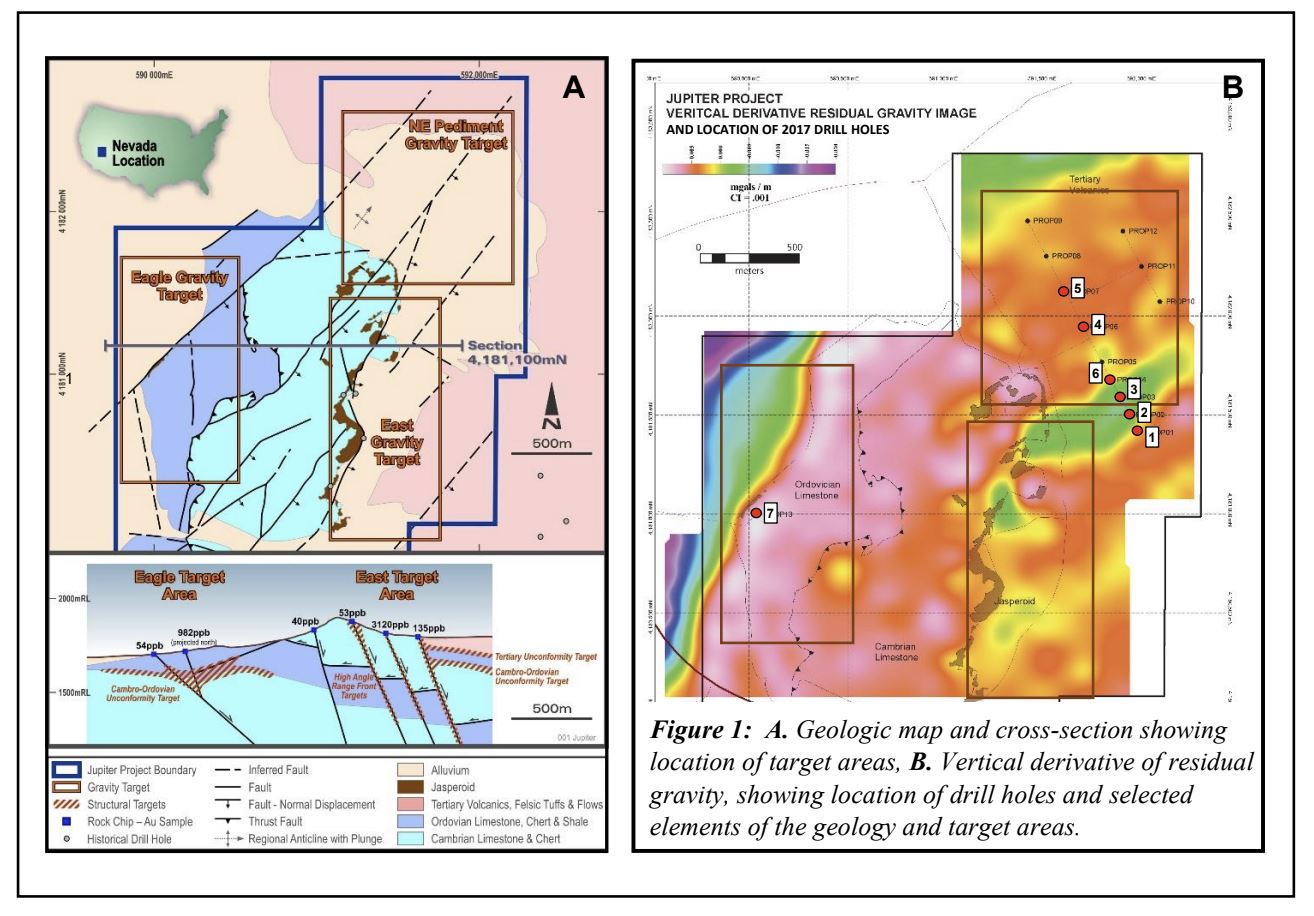 Robert Felder, President and CEO states, “We are quite pleased to encounter meaningful gold intercepts in our first drill program at Jupiter, and very much look forward to further drilling to test these and other target areas. Our 2017 drilling programs on six, partner funded projects has been successful in identifying two Carlin-type systems under cover at Jupiter and Spruce East that have encountered significant anomalous to gram plus mineralization warranting follow up.”
